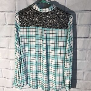 Vanity Womens Button Down Plaid Shirt with Sequins Accent Size Small Green white black