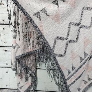 Add some cozy boho vibes to your wardrobe with this Vanity open-front cardigan in a Southwest-inspired geometric pattern. Featuring neutral tones of beige, soft peach, and charcoal gray, this mid-weight knit sweater includes an asymmetrical hem and decorative fringe trim for added flair. Perfect for layering over your favorite tops or dresses, this cardigan adds warmth and style to any outfit.