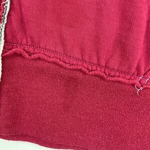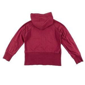 Vanity Eagles magenta zip up hooded sweatshirt, varsity stripes on sleeves, has a faint mark on the front that is barely noticeable and some discoloration on the hood line (may be able to launder). Otherwise good gently worn condition, displayed on women’s size medium (8-10) dress form, good lounge, athleisure or casual wear zip up hoodie