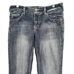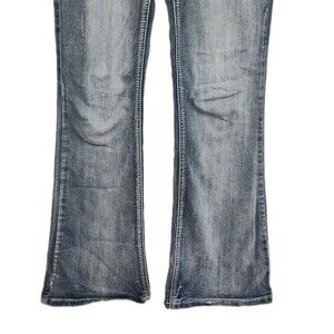The Vanity bootcut women's jeans in size 27 short feature a solid medium wash blue color with embroidered accents and a mid-rise fit. Made from a comfortable cotton blend denim fabric, these jeans have a regular fit with a classic 5-pocket design and a 30-inch inseam. The zip and button closure adds to the stylish look of these petite-sized jeans, perfect for everyday wear or dressed up for a night out. Easy to care for with machine washable instructions, these jeans are a versatile addition to any woman's wardrobe.