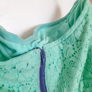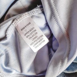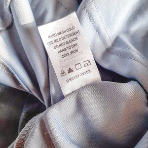 Strappless with front support and cup grips. Top is textured patterned with pleated layered bottom in polka dots. Worn once. Fits on the larger side.