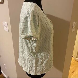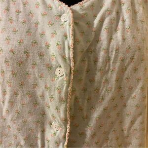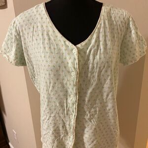 Very cute and worn only twice. This size medium Vanity Fait two piece pajama set is so cute. Button down top with short sleeves. Matching shorts with drawstring elastic waist. Mint green pattern with light pink floral design.