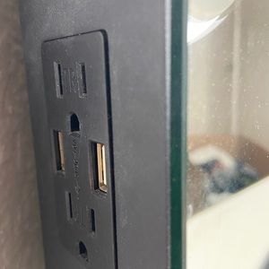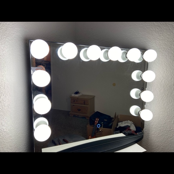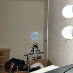 Beautiful brand new vanity with touch screen mirror and a built in speaker with two USB ports and two plug in ports all work!! All lights work and brightness of light can adjust.