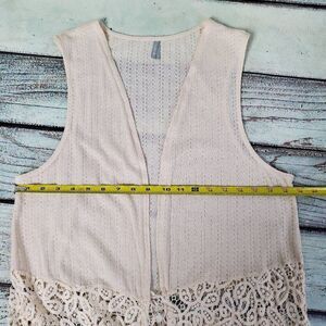 Add a light and breezy touch to your outfit with this Vanity women's sleeveless vest in size Large. This open-front layering piece features a soft cream knit with delicate lace panels and fringe trim at the hem for a perfect boho-chic vibe. Ideal for spring and summer, it can be worn over tanks, dresses, or tees for an effortlessly stylish look.