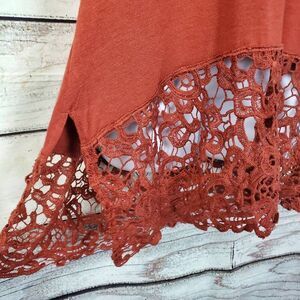 Flowy sleeveless tank top in a gorgeous rust color. Features a high-low hem with intricate crochet lace detail. Perfect for layering or wearing alone in warmer weather.