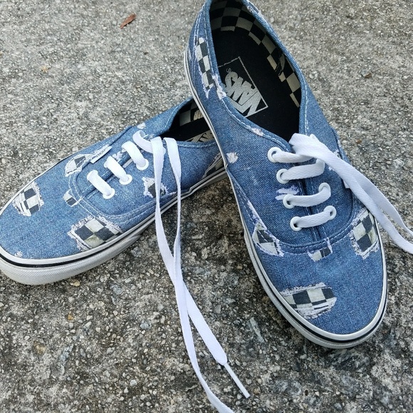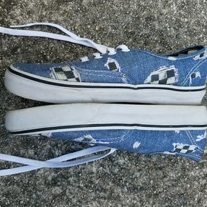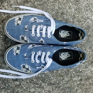 Denim style Vans. Clean laces, currently bar laced. Wore twice. Only the back heels look worn down (as shown in pictures).