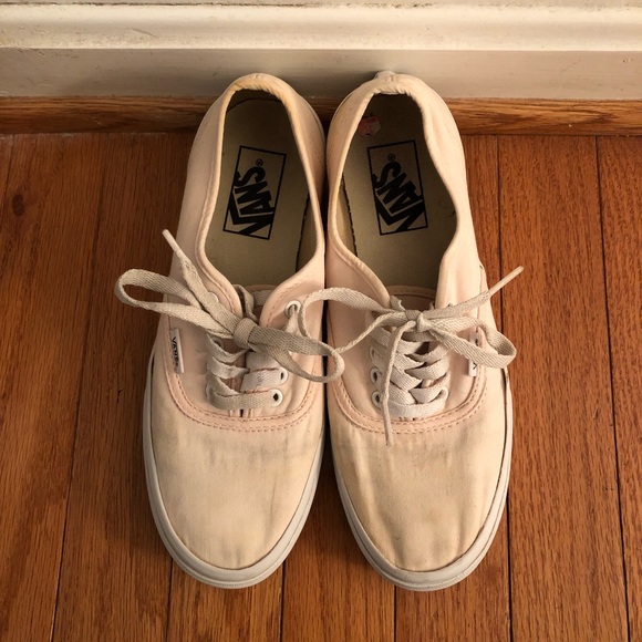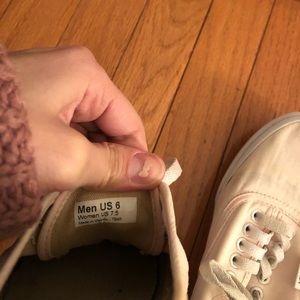 Light pastel pink vans. Threw these in the wash and the fabric feels and looks warped. Runs a little small too. See pictures for flaws