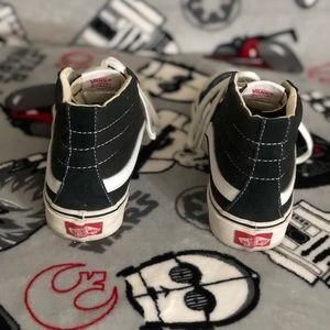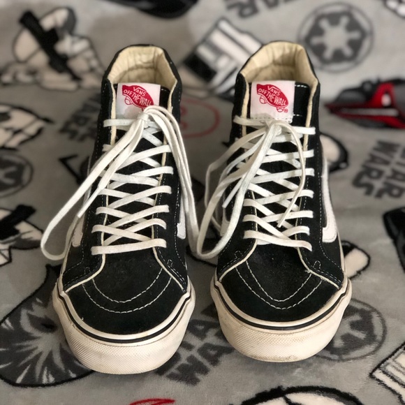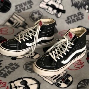 Hightop Vans that I have only worn about 3 times. Have been in storage for most of their life. They have some small scuffs here and there from being stored, but nothing a little TLC can’t fix!
