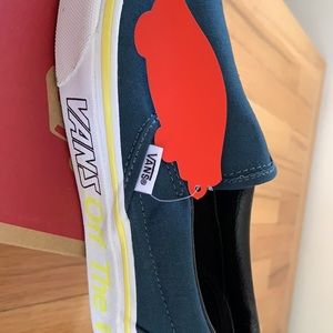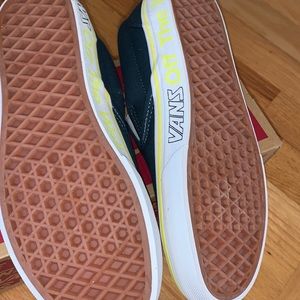 NIB slip on Vans green/blue with neon yellow writing. Women’s size 6.5