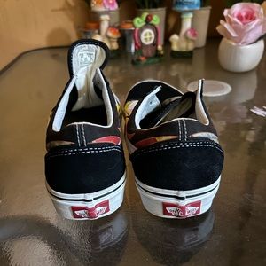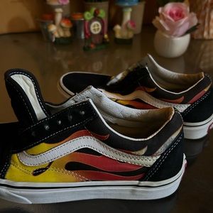 Fire Flame Vans. They’re in pretty good shape and only been worn a few times there aren’t bad flaws. They look pretty much new and have been washed and cleaned. Size 4.5 in men’s and 6.0 in women’s. Comes with laces