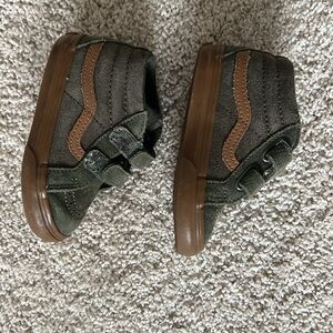Size toddler 6.5 army green and tan van high tops. Worn but have a lot of life left