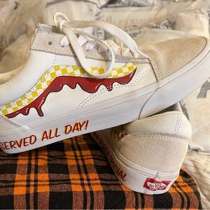 These are Van’s shoes Women’s Size 10. They have been worn two times. No scuff marks or discoloration. Leather and suede