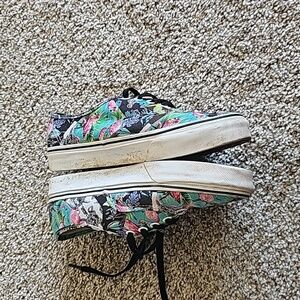 colorful vans shoes with flamingos, lemons, cute little dinosaur design on them