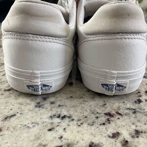 Vans white and purple color way in excellent condition size 9.5 in women shoes don’t have the insoles and I do have the shoe laces to them used them a few times have lots of life on them shoes are leather
