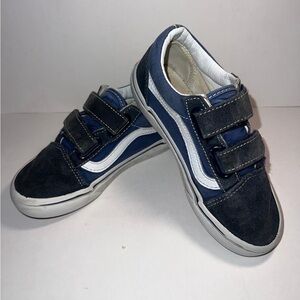 Vans Stylish and comfortable kids sneakers featuring a blue and gray design. Easy-to-use Velcro straps for a secure fit.