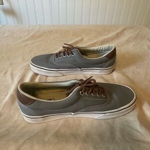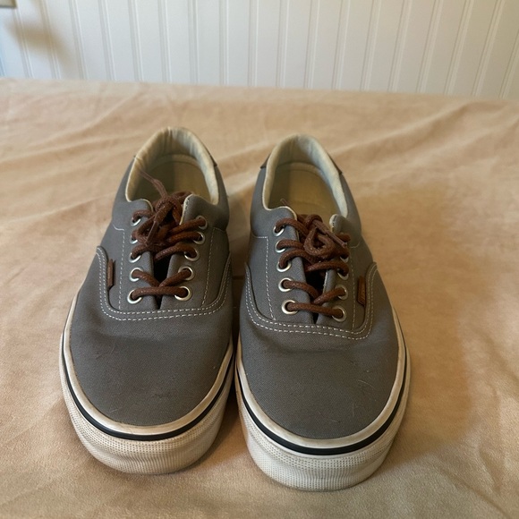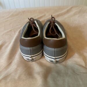 Gray vans, lace up, brown leather trim, and light blue denim lined inside. Women’s size 9, men’s 7.5. See photos for condition and measurements.