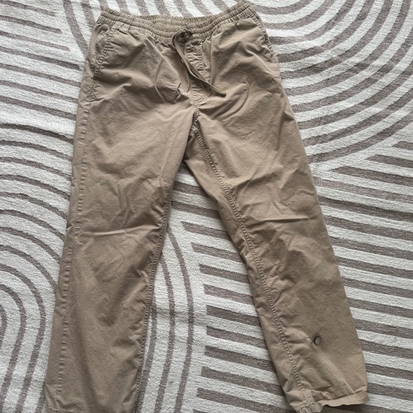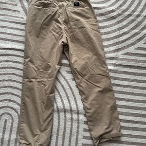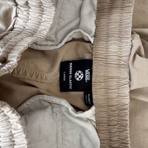 The pants are identified as the Vans Range Relaxed Elastic Pants in a beige or tan color. These pants feature a relaxed fit with an elastic waistband and drawstring. They have front slash pockets with a coin pocket on the right side and rear welt pockets with button closures. The pants are made of a cotton blend with elastane for stretch and comfort.