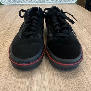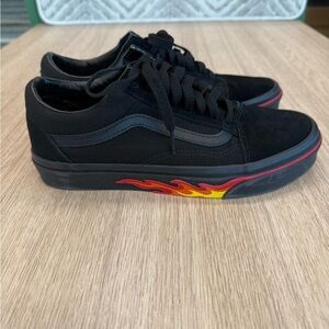 Black Vans with vibrant flame design. Men’s 7. Women’s 8.5. Worn twice still in great condition.