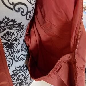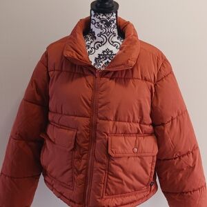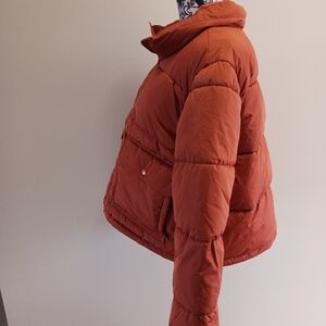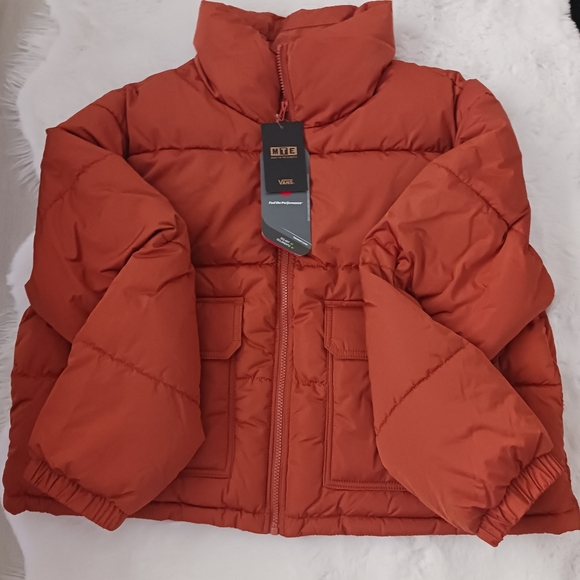Vans stylish rust orange puffer jacket with front pockets and a high collar. Perfect for chilly days.