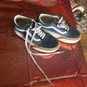 Vans Old Skool Blue Navy Suede Canvas Sneakers, Classic Skateboard Shoes. Features the iconic side stripe, durable gum sole trim, and white contrast stitching. This skate-inspired design offers a timeless low-top silhouette with reinforced toecaps and supportive padded collars. Good pre-owned condition with some signs of wear on the midsole and laces from normal use. Perfect for casual wear or skating.