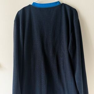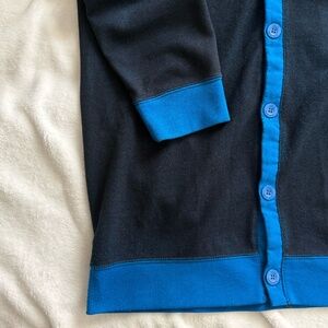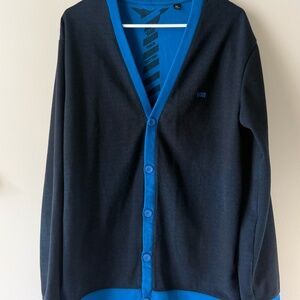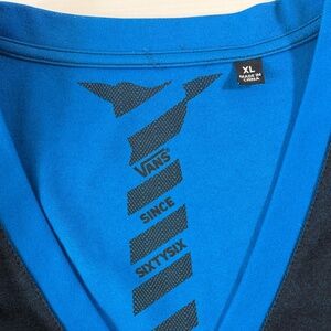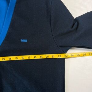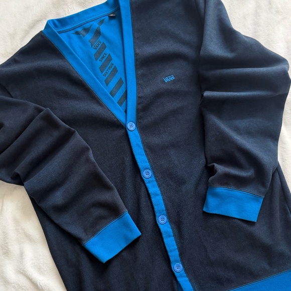 Button-front cardigan sweatshirt with contrast blue trim and subtle Vans chest logo. Soft fleece interior with a relaxed, easy fit. Cool hybrid piece that wears like a sweatshirt but styles like a cardigan - very early-2010's skate influence. Size XL. Condition: Good. Works well played over a tee. Easy skater, norm core, or casual streetwear piece.