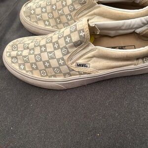 Elegant slip-on shoes with a beige checkered pattern. Features iconic Louis Vuitton monogram.