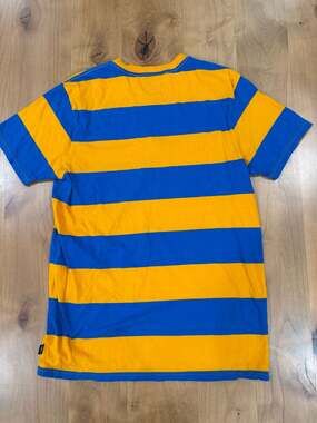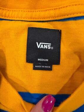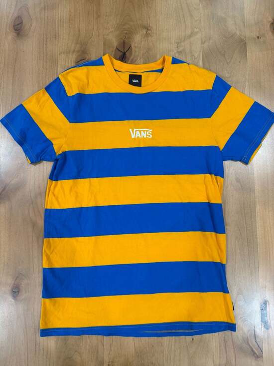 Vans Striped Short Sleeve T-Shirt, Blue and Yellow, Men's Size Medium. This classic skate tee features bold horizontal stripes in vibrant blue and yellow. It includes a white embroidered Vans logo on the center chest and a small logo tab at the side hem. Lightweight and comfortable for everyday wear.