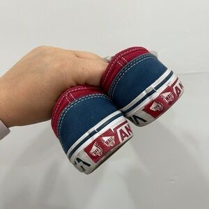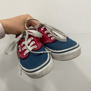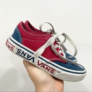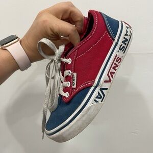 Red white and blue lace up sneaker. Spellout sole.