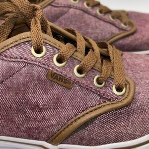 The Atwood by Vans, a low top design in twill red with leather piping and a textile upper with the signature micro-waffle outsole, metal eyelets, padded tongue and collar. In EUC, the lace ends have been removed which does not affect the overall design or performance.