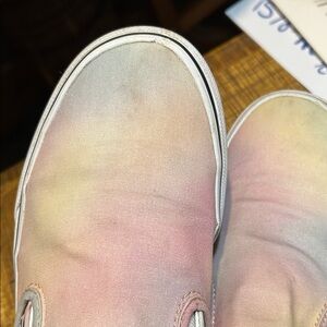 Vans slip-ons with a multicolor gradient. Recently washed, true to size. Great condition and very cute for spring! Small stain on top of toe which is pictured