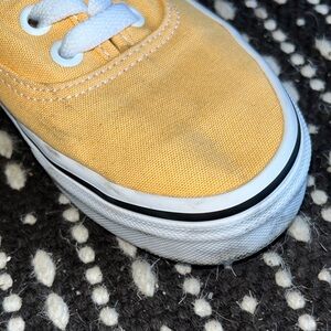 More of a tangerine-ish color canvas shoes by Vans. White laces and soles. Classic style. Worn and has a few little scuffs but have been washed.