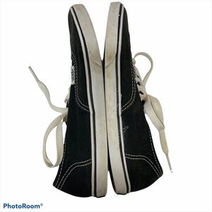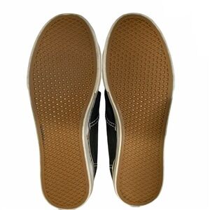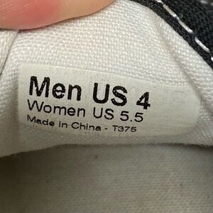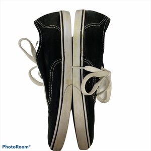 Casual athletic low profile black canvas sneaker with white sole. White laces, lace-up style. Lightweight.