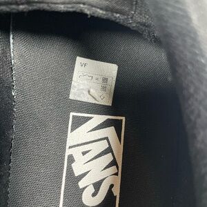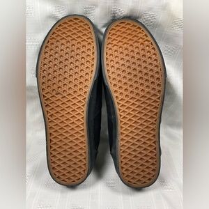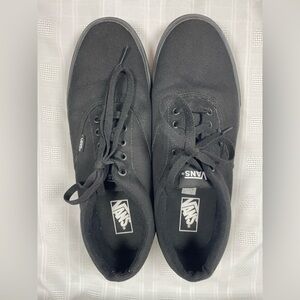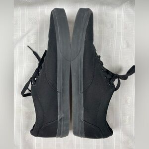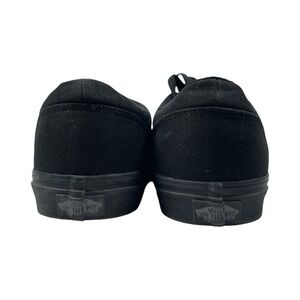 Classic Vans Authentic sneakers in the all-black colorway. Low-top lace-up design with durable canvas uppers, rubber waffle outsoles, and “Vans Off the Wall” branding on the heels.