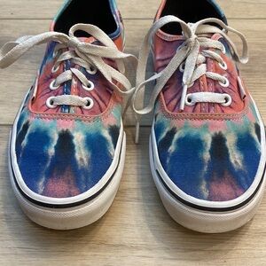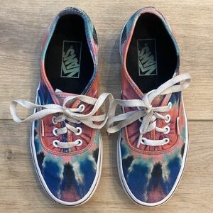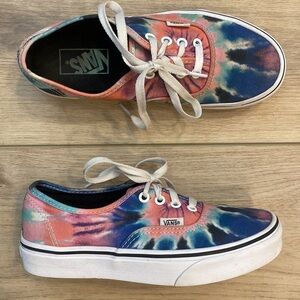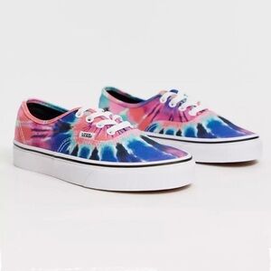 A funky twist on the classic low profile Vans authentic lace up tennis shoe the tie dye multi / true colorway is sure to put a bounce in your step. Featuring a full wrap of pink blue and purple tie dye. In gently used condition, size 6.5