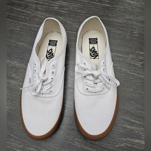 Vans Authentic Vintage White / Gum Sole. Low top Skate vans, Size 12 WIDE CUSTOMS. New without tags. Dusty from storage, never worn. See pictures for condition details. Smoke-free and pet free home.