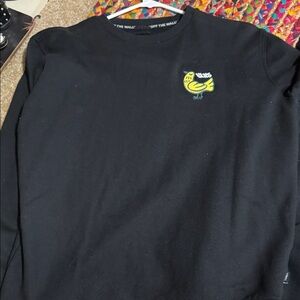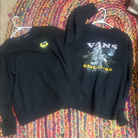 Pair of black Vans sweatshirts featuring unique graphic prints. Ideal for everyday style. Both size medium