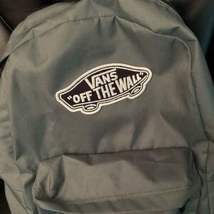 Vans Realm Thyme Backpack. Excellent condition. Solid color. Large patch on center front. Main compartment zip closure. Laptop sleeve. (Fits most full-sized laptops) Organizer in front pocket. Classic padded shoulder straps. Dimensions: