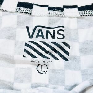 Introducing a Vans Bikini Tube Top in women's size large, featuring a black-and-white checkered pattern. Designed as part of Vans' swimwear line, this bandeau-style top offers a strapless fit for a sleek and minimalist look. Made from a cotton blend for stretch, durability, and quick-drying comfort. This top is new.