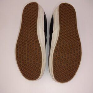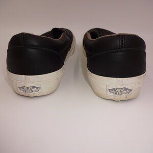 Good to very good pre-owned condition. A pair of black laser cutouts slip-on Vans. Minimal wear to the soles. Scuffing/marks to the white rubber. Approximate measurements: heel height 1-1/4", length 9-1/2", and width 3".