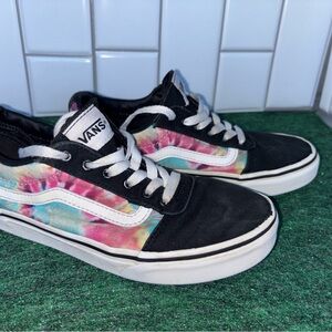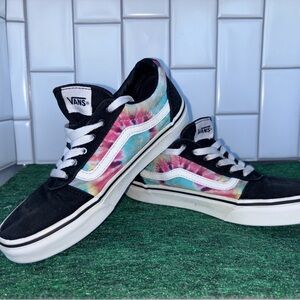Stylish Vans sneakers with a vibrant tie-dye design. Features black and white accents.
