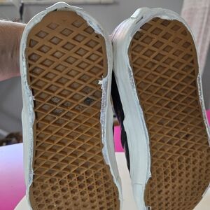 Experience the perfect blend of style and comfort with these Vans black woven leather slip-on loafers. Featuring a sleek design with elastic side panels for easy wear, these shoes are ideal for casual outings. The intricate woven leather detail adds a touch of sophistication to your everyday look. someone ut white out or white shoe polish around the edges. ( pictured) in rather good shape.