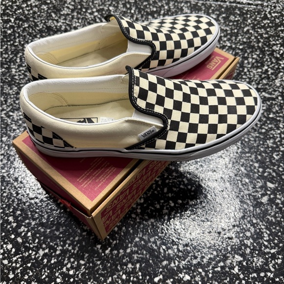 Vans slip-ons with iconic black and cream checkerboard design. Easy to wear and versatile. Worn twice, ships today!