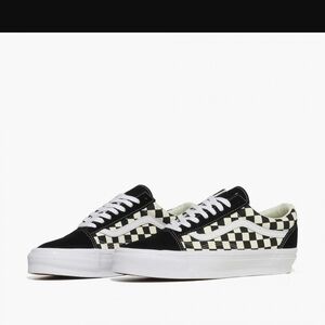 Classic Vans with a bold checkered design. Features black and cream colors. Ideal for everyday style.