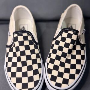 Classic Vans slip-ons with a bold black and cream checkered design. Easy to wear and stylish.
