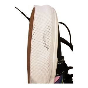 Stylish Vans high-top sneakers. Black base with multicolor accents. Lace-up design.