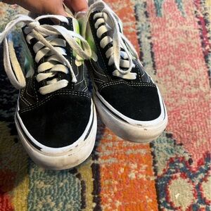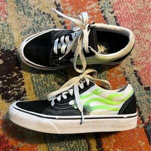 Stylish Vans sneakers with a black base and neon green accents. Perfect for casual wear.