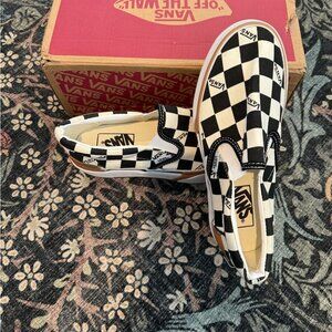 Classic Vans slip-on with black and white checkered pattern. Comfortable and stylish design. Perfect for casual wear.