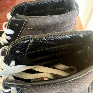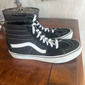 Classic high-top design. Black canvas with white accents. Durable rubber sole. Light used condition. I have plenty of vans and i’m sure these have years left in. Probably only a year old and I haven’t wore much. a little tight on me, but true to size.
