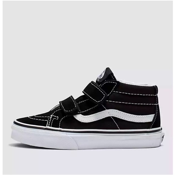 Experience the classic skate-inspired style with these Vans sneakers, featuring a black canvas and suede upper with a signature white side stripe. The mid-top silhouette offers enhanced ankle support, while the velcro straps provide a modern twist on traditional laces. A durable rubber outsole ensures long-lasting wear.