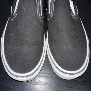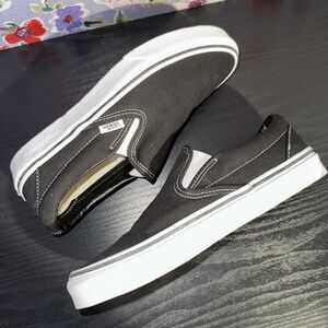 Classic Vans slip-on sneakers. Black canvas upper. White rubber sole. Comfortable and stylish.